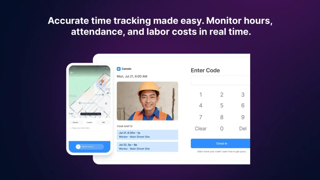 Clock in with GPS, Wi-Fi, PIN, or even a selfie. Camelo prevents time fraud, auto-generates timesheets, and syncs directly with payroll.