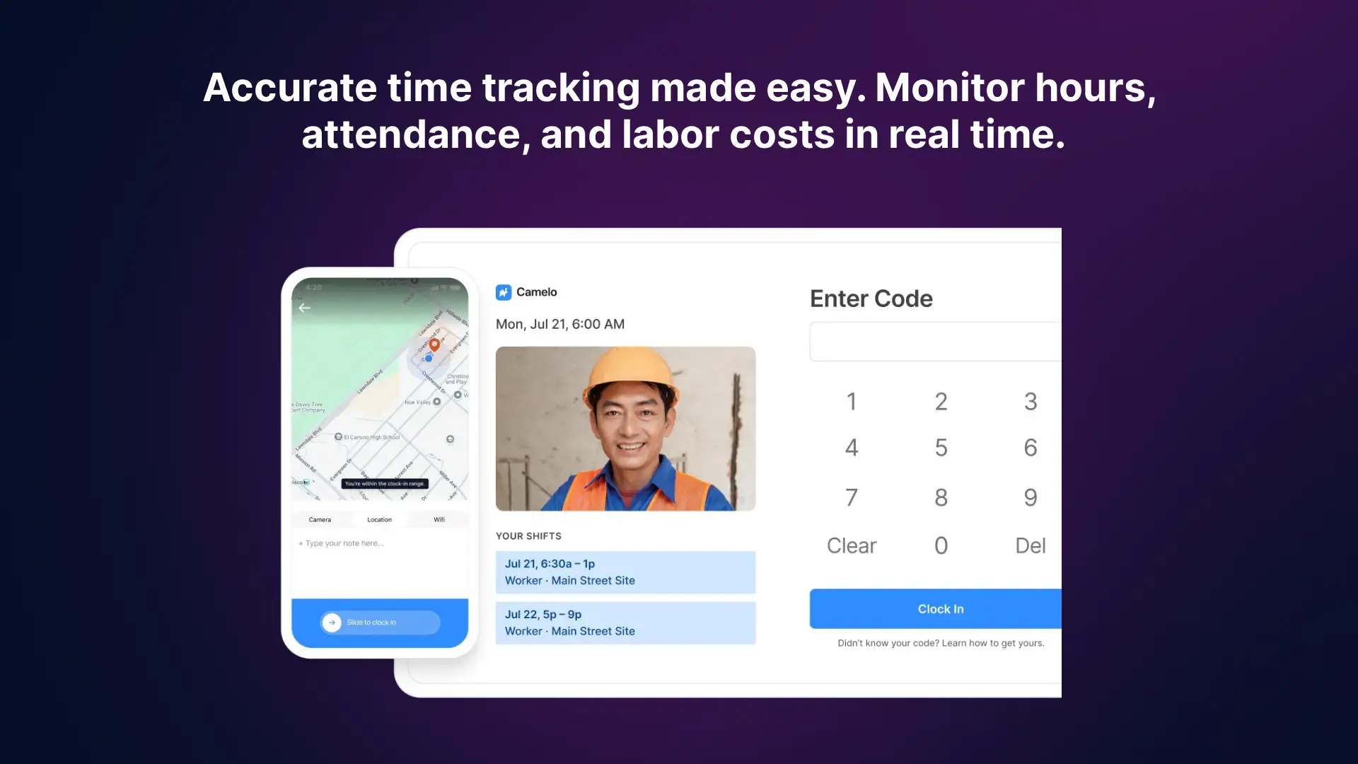 Absolutely. With GPS location tracking, geo-fencing, and photo verification, Camelo ensures clock-ins happen at the right place and time.