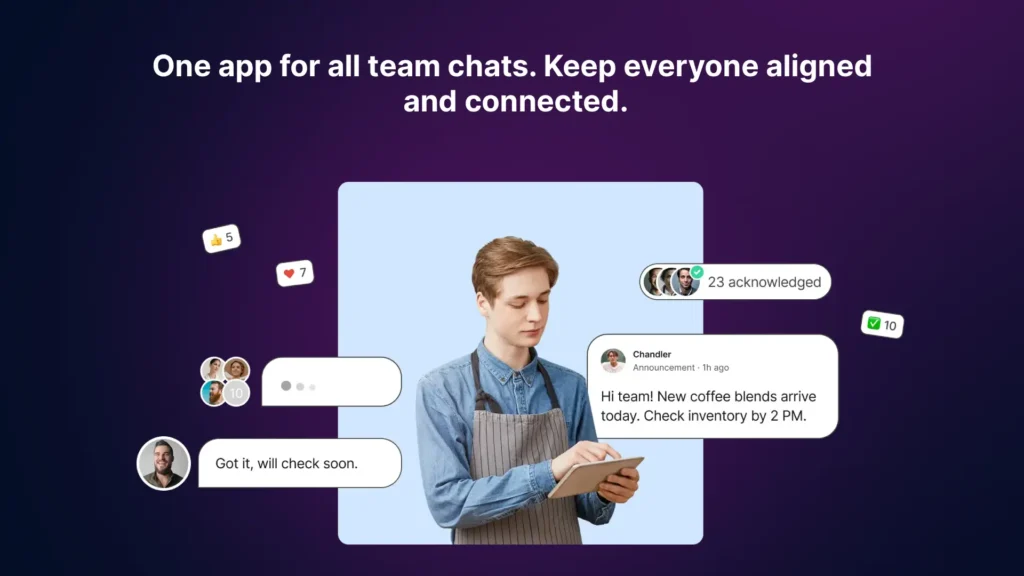 Announcements, chats, and team boards all in one place. Reach 100% of your staff without relying on scattered apps.