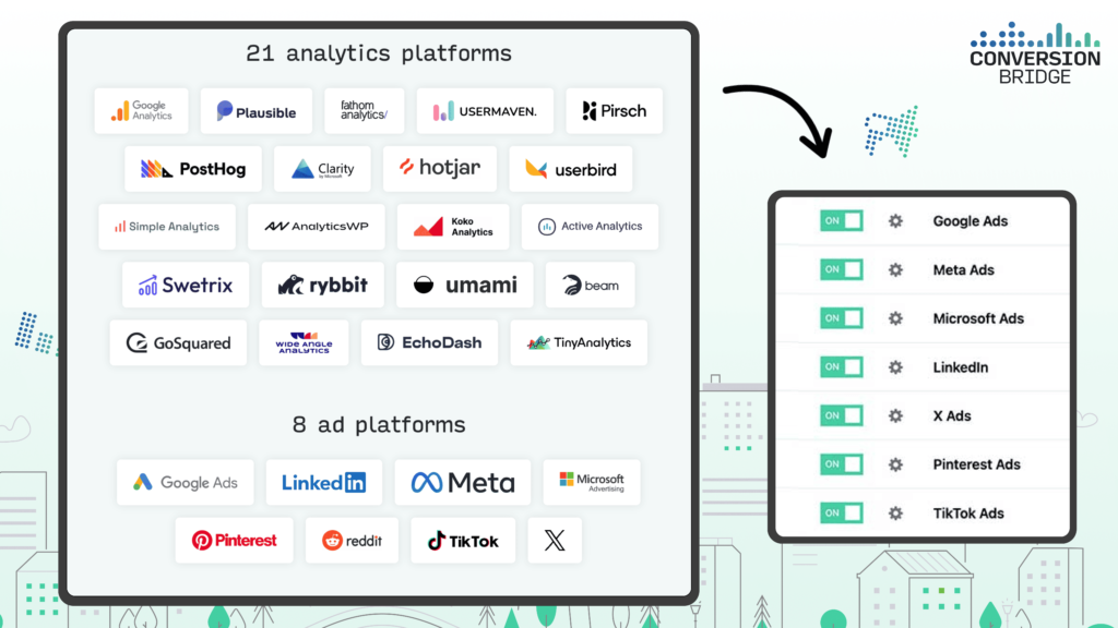 • Track conversions across 8 ad platforms – Google Ads, Meta, TikTok, LinkedIn, Microsoft, Pinterest, Reddit, and X