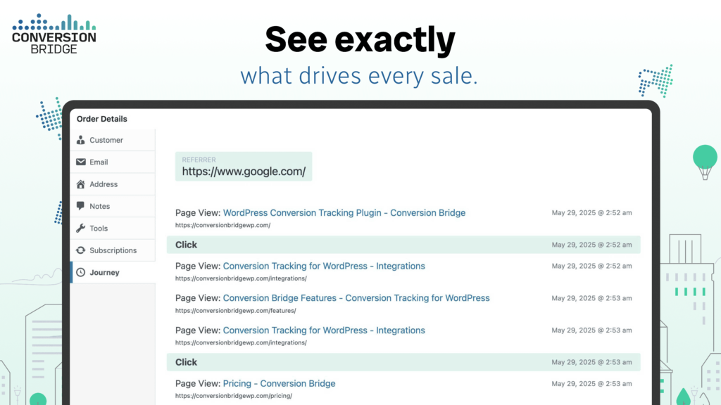 • Works across all integrations. Every conversion event, every plugin, fully tracked