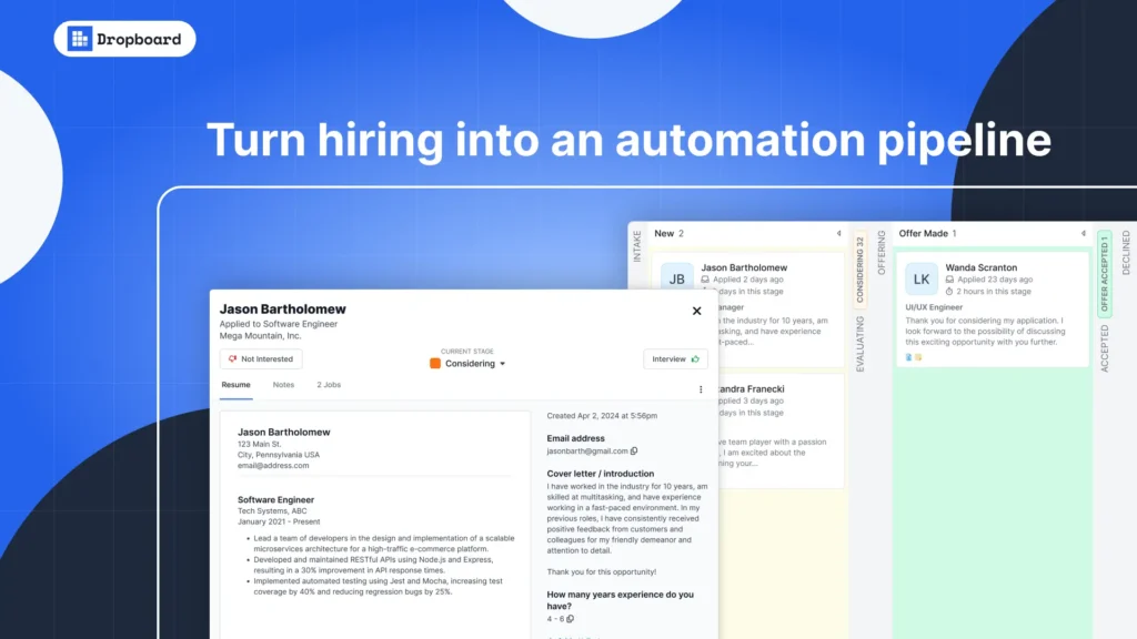 Dropboard gives you a gorgeous career site, lightning-fast AI job writing, a visual ATS your team will actually love, and white-label superpowers that can turn your recruiting side hustle into a serious business.