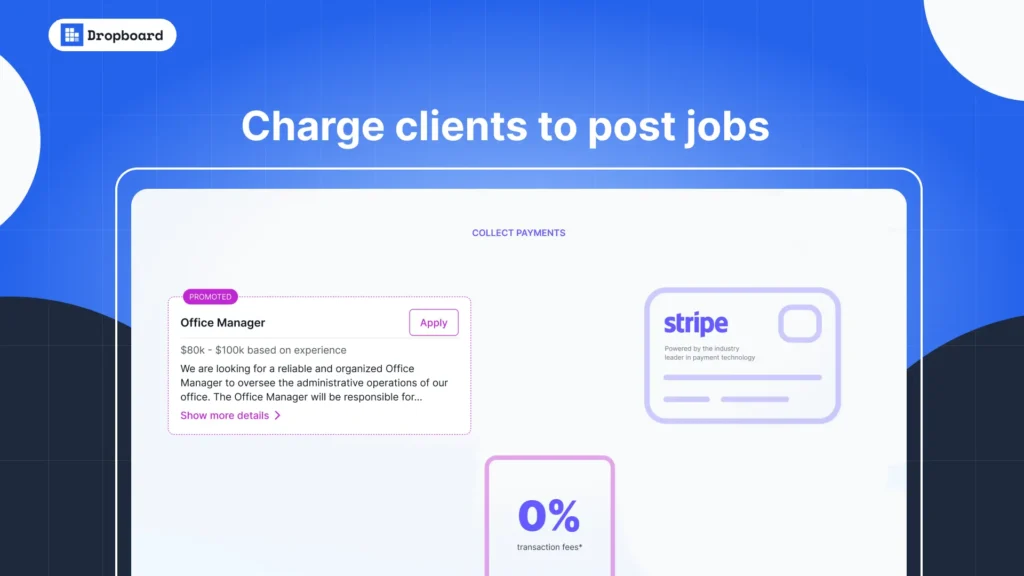 • Charge clients per job post or subscription, Dropboard collects and sends you the money