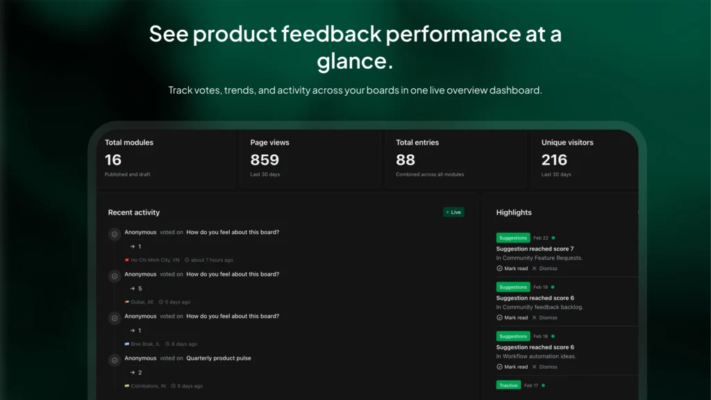 • Embeddable widgets and shareable boards collect feedback anywhere.