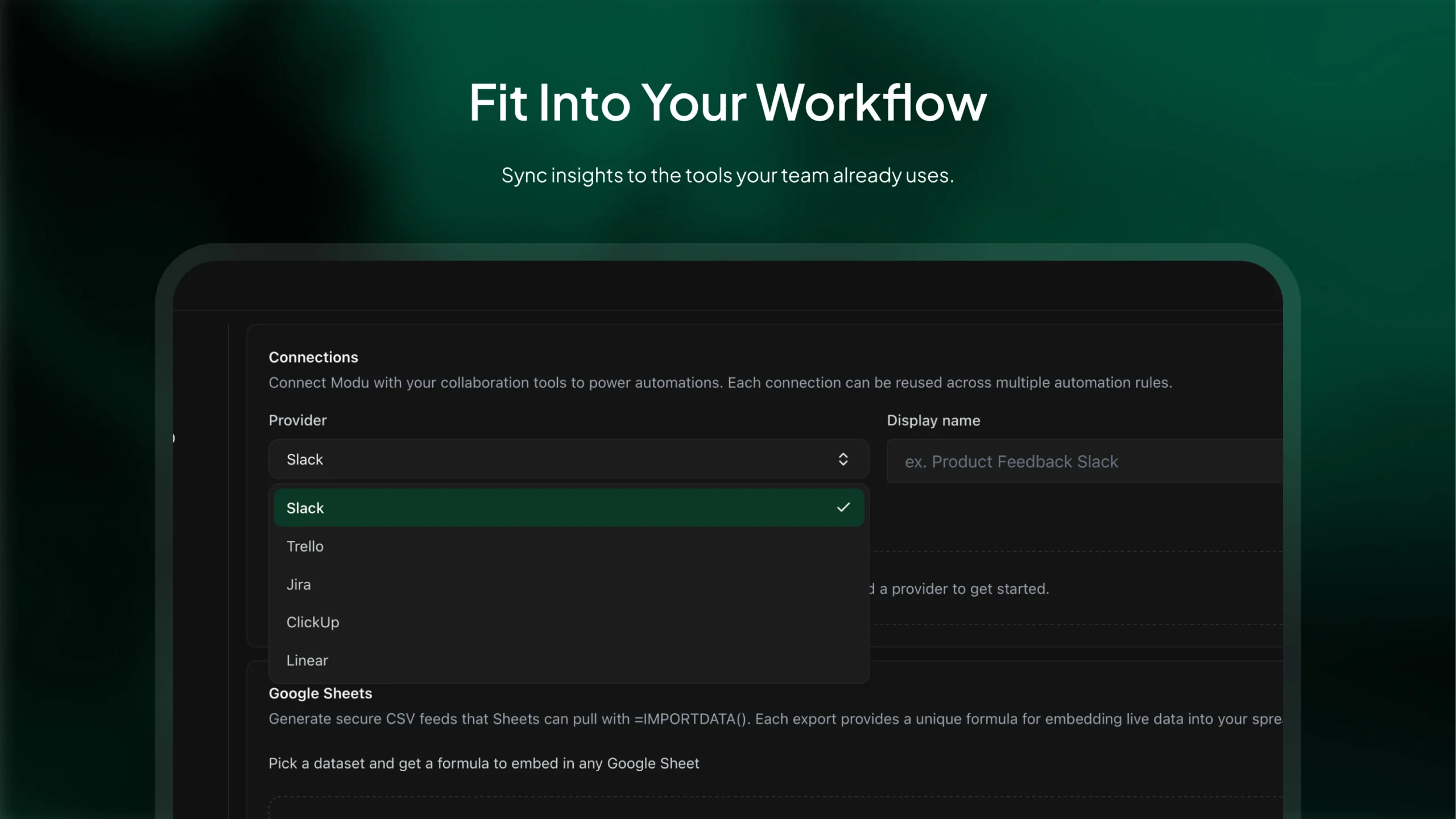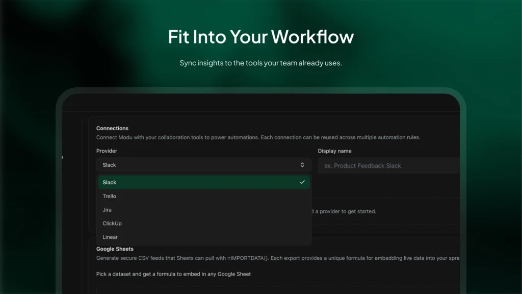 • Sync with Slack, Jira, Trello, ClickUp, Linear, and Google Sheets