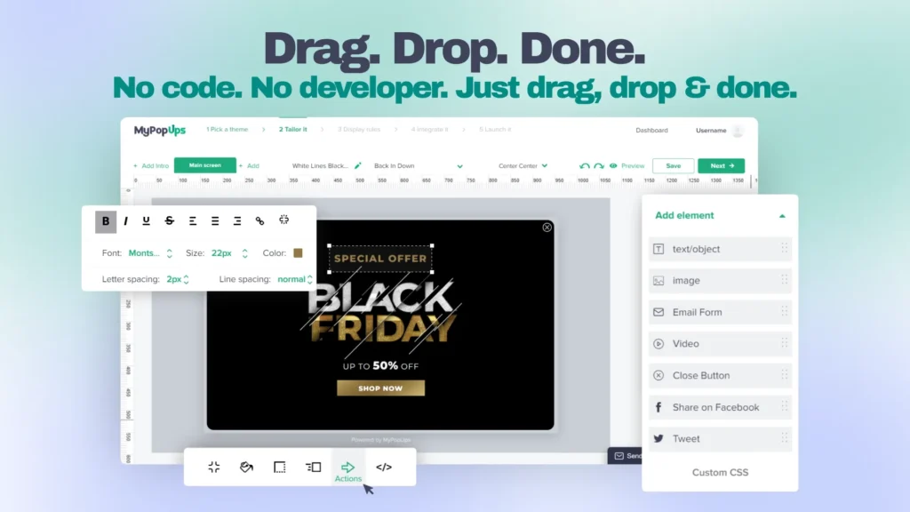 Forget hiring a developer every time you need a new popup. MyPopUps’ drag and drop builder gives you full creative control without the technical headache.