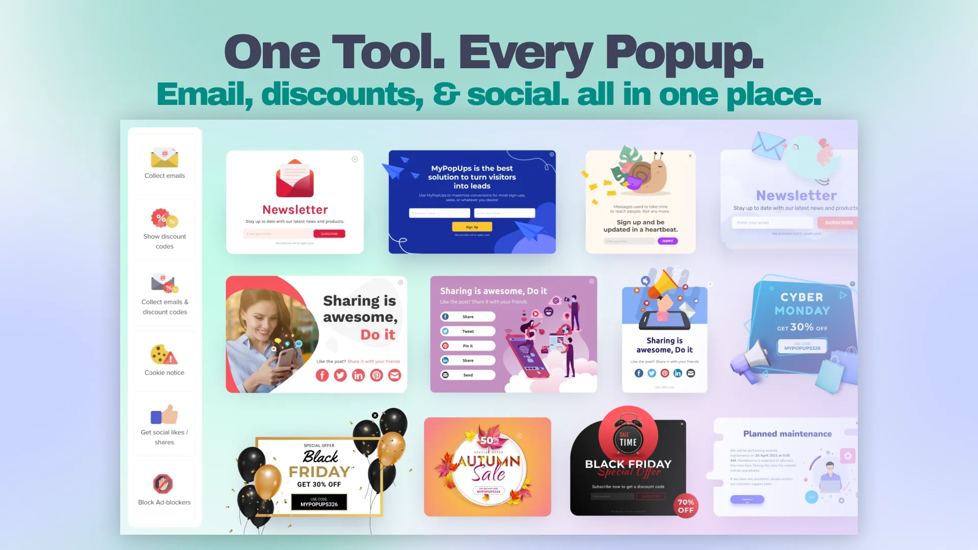 • Supports 5 popup types: email capture, discounts, cookies, ad-block, social.