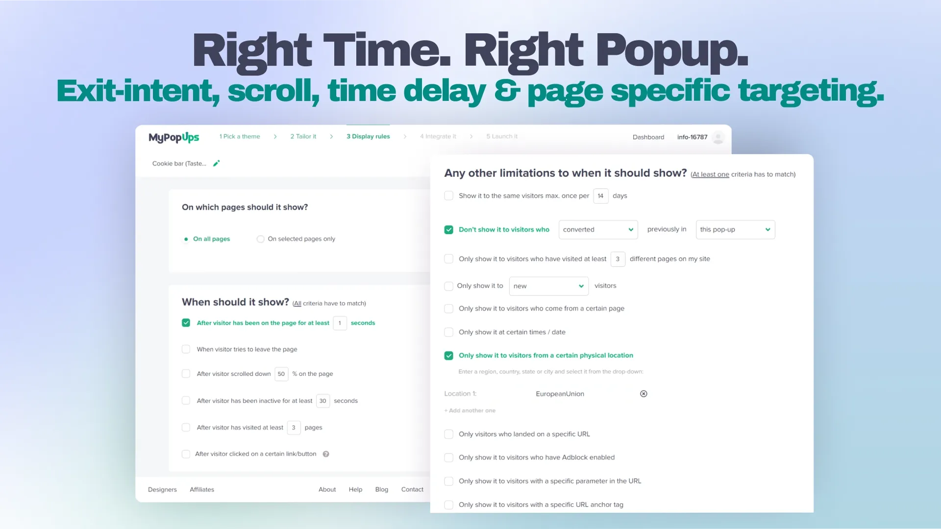• Advanced display rules show the right popup to the right visitor at the right time.