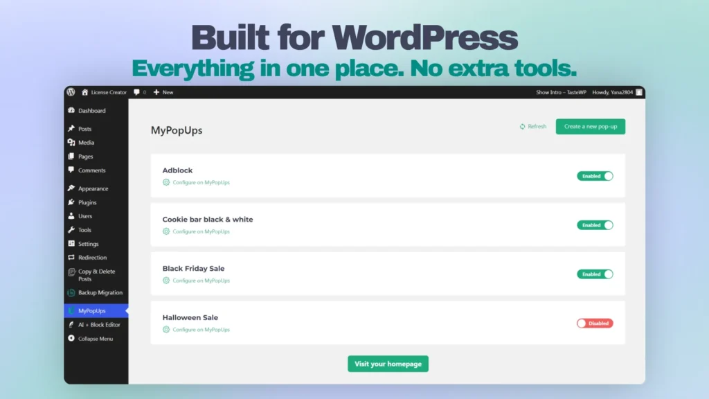 No painful setup. No switching between tools. MyPopUps plugs directly into WordPress so you can manage everything from one place.