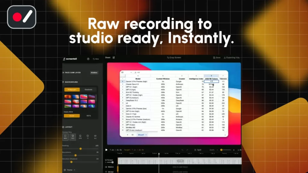 Screentell turns your everyday screen recordings into cinematic, studio quality demos – straight from your browser, in minutes. No installs. No complexity. No more embarrassing product videos.