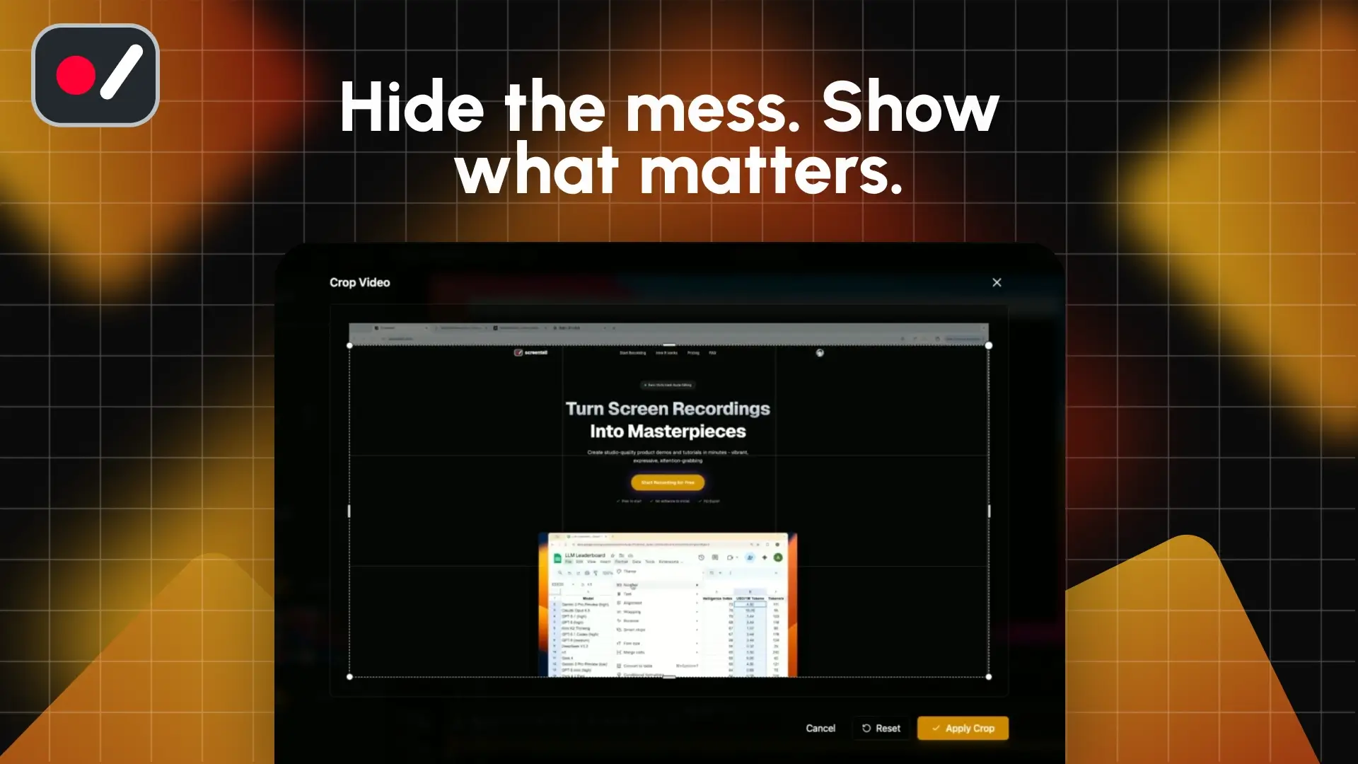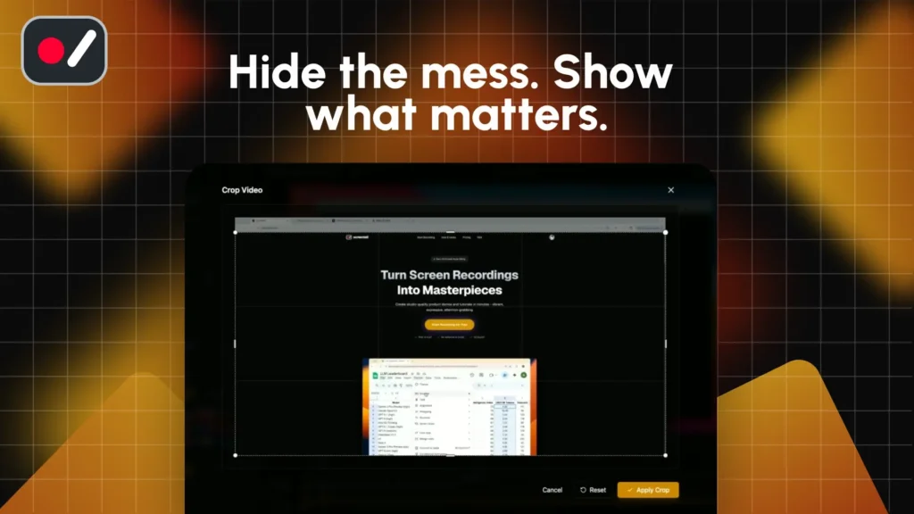 Your demo is great. Your browser tabs, notification badges, and taskbar? Not so much. Screentell’s cropping tool lets you show exactly what you want, and hide everything you don’t.