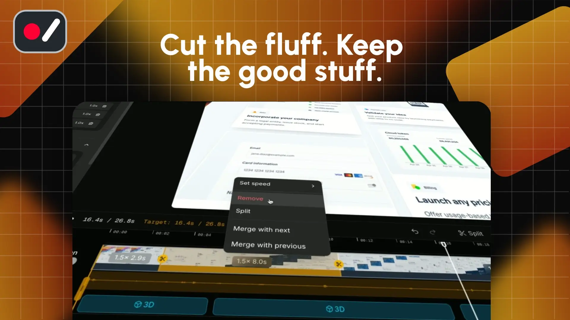 Every recording has that moment: the awkward pause, the accidental tab switch, the loading screen that takes forever. Screentell makes those moments disappear before anyone has to sit through them.